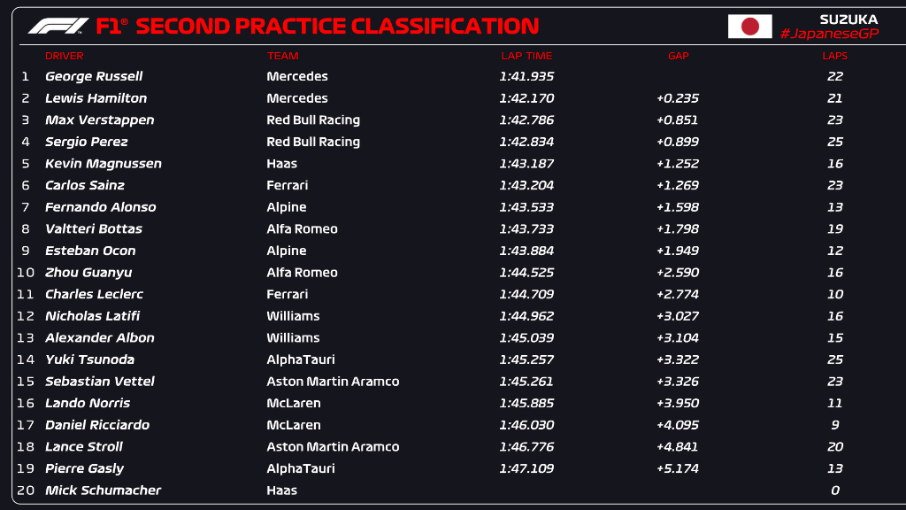 Ottimo quinto tempo per la Haas di Kevin Magnussen, mentre Mick Schumacher non ha preso parte alle FP2 dopo essere finito contro le barriere alla fine delle prime libere. Sesta la Ferrari di Carlos Sainz davanti all’Alpine di Fernando Alonso, autore del miglior crono nelle FP1, con Esteban Ocon nono, divisi dall’Alfa Romeo di Valtteri Bottas e il compagno di squadra Zhou Guanyu a chiudere la top 10. Undicesimo Charles Leclerc, davanti alle Williams di Nicholas Latifi e Alex Albon e al pilota di casa Yuki Tsunoda, 14°, seguito dal quattro volte vincitore del GP del Giappone Sebastian Vettel. A chiudere la classifica di questo venerdì, le McLaren di Lando Norris e Daniel Ricciardo, 16° e 17°, l’Aston Martin di Lance Stroll e l’AlphaTauri di Pierre Gasly.