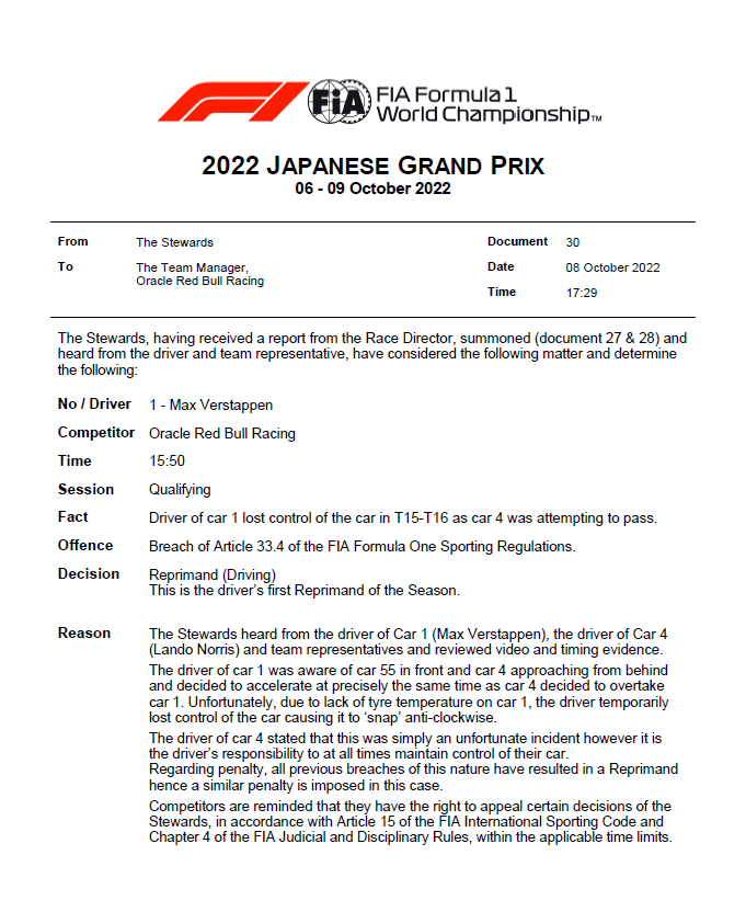 Ma, come da copione, il risultato sarà ufficiale solo dopo l’investigazione della FIA sull’episodio che ha coinvolto Verstappen e Lando Norris nel Q3, quando Verstappen sta scaldando le gomme e sbanda a sinistra all’uscita della 130R costringendo il pilota McLaren a spostarsi per evitarlo, cosa di cui Max si è scusato subito. “Nessun rischio da parte mia, ma quello che ha fatto lui è stato pericoloso, ha cercato di difendersi contro di me”, ha detto Lando Norris. “Sarebbe stato un grosso incidente se mi avesse preso. Io non ho fatto nulla di sbagliato, lui sì: ha certamente condizionato il mio giro, avevamo scelto di giocarci le gomme nuove per il primo tentativo. Iniziarlo con le gomme sull’erba non è stato l’ideale. Magari sarei arrivato nono e non sarei salito molto più su, ma non è stato l’ideale per partire”. E stavolta la decisione è arrivata velocemente: Solo una reprimenda per Verstappen, niente penalità, con questa motivazione: “Episodi del genere in passato hanno sempre avuto una reprimenda per cui anche stavolta viene imposta una simile sanzione”.