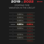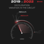 Delle 7 frenate di Phillip Island nessuna è considerata altamente impegnativa per i freni, 2 sono di media difficoltà e le altre 5 sono light. Con i suoi 282 metri di spazio di frenata, la prima curva dopo il traguardo è la più dura per l’impianto frenante: le MotoGP passano da 344 km/h a 181 km/h in 4,1 secondi durante i quali i piloti esercitano un carico sulla leva di 4,3 kg e subiscono una decelerazione di 1,5 g.