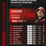 Ora Bagnaia guida la classifica con 14 punti di vantaggio su Quartararo, 27 su Espargaro e 42 su Bastianini. Nel GP di Malesia in programma il prossimo weekend al Sepang International Circuit Pecco ha quindi la prima occasione per chiudere i giochi.
