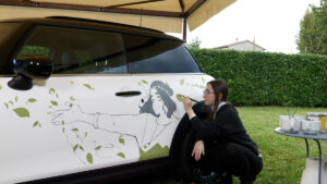“Prendendo ispirazione dalla sottocultura Ita-Sha di appassionati di modding automobilistico in Giappone, ho creato due personaggi, uno per ogni fiancata, che si incontrano poi simbolicamente sul cofano nello slogan Big Love. Ita-Sha, scritto 痛車 racchiude i simboli di “dolore” e di “macchina”, il dolore è dato dalla quantità sovra stimolante di colori e dal cringe dei soggetti rappresentati, ma Ita-Sha, scrivendolo invece イタ車 è anche la macchina italiana. Ho inserito quindi l’estetica italiana, rendendo la mia interpretazione più elegante e digeribile rispetto alla Ita-Sha classica, attraverso un diverso utilizzo del colore che richiama i monocromatici manga più che l’animazione”, ha dichiarato Caterina Rocchi.