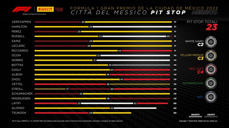 Partito su P Zero Red Soft, Max Verstappen è rimasto al comando del GP di Città del Messico fino al momento di montare le P Zero Yellow Medium al 25^ giro, cedendo la testa della corsa alle Mercedes, per poi tornare nuovamente in vantaggio una volta che sia Russel sia Hamilton hanno effettuato la sosta prevista. L’olandese ha gestito le Medium completando uno stint di 46 giri, mantenendo un gap di 15 secondi su Hamilton. Con una griglia di partenza che ha visto dodici piloti prendere il via sulle Soft e otto su mescole Medie, le strategie hanno fatto la parte del leone fin dai giri iniziali. Il duello principale ha visto Red Bull avere in Mercedes i rivali principali, con quest’ultimi che hanno scelto le Hard per il secondo stint dopo una partenza su mescole Medie, eguagliando con il secondo posto di Lewis Hamilton il risultato ottenuto ad Austin, fin qui il migliore della stagione. Russell, uno dei tre piloti a effettuare due soste, ha montato le Soft nel finale di gara al fine di metter in cassaforte il punto a disposizione per il giro più veloce.