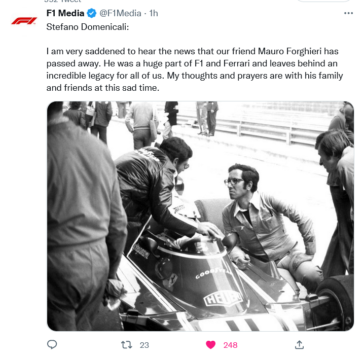 Dopo la notizia della morte dell’ingegner Mauro Forghieri, tra i primi commenti quello dell’Amministratore Delegato e CEO della F1 Stefano Domenicali: “Sono molto addolorato nell’aver appreso la notizia della scomparsa del nostro amico Mauro Forghieri. E’ stato una parte enorme della F1 e della Ferrari e lascia dietro di sé un’eredità incredibile per tutti noi. I miei pensieri e le mie preghiere vanno alla sua famiglia e ai suoi amici in questo tristissimo momento“.