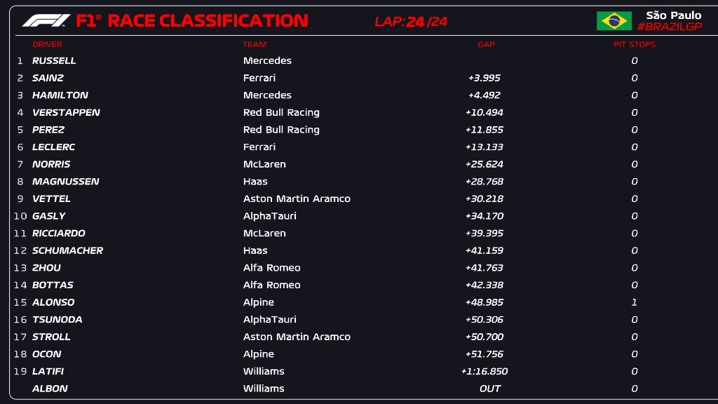 Alla bandiera a scacchi Russell, Sainz e Hamilton, poi le Red Bull di Verstappen e Perez. Sesto Leclerc, seguito da Norris e dal poleman Magnussen, cui è andato l’ultimo punto della Sprint. Nono Vettel, seguito dall’AlphaTauri di Pierre Gasly, dalla McLaren di Daniel Ricciardo, dalla seconda Haas di Mick Schumacher e dalle Alfa Romeo di Zhou Guanyu e Valtteri Bottas. Hamilton, Ricciardo e Zhou saranno investigati dopo la gara per possibili infrazioni nella procedura di partenza, per cui potrebbero esserci cambiamenti in classifica se Lewis dovesse essere penalizzato. A chiudere la classifica Alonso, 15°, Yuki Tsunoda, Stroll, Ocon e Nicholas Latifi, con Alex Albon ritirato.