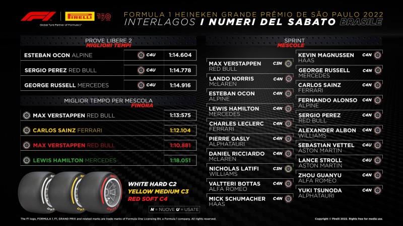 Nonostante una probabilità di pioggia nelle previsioni meteo, la F1 Sprint si è corsa con il sole, con una temperatura ambientale tra i 22 e i 23 gradi. L’asfalto ha invece fatto registrare valori tra i 31 e i 34 gradi circa. Confermate le previsioni sul divario prestazionale tra i diversi tipi di mescola. Tenendo conto dell’evoluzione della pista, tra P Zero White hard e P Zero Yellow medium si è stimata una differenza di 0.7s, divario più sottile tra Medium e Soft, che si attesta su 0.3s. Le prove libere sono servite ad alcuni team per prepare le strategie per il pomeriggio mentre altri si sono concentrati sulla gara di domenica. La Soft ha permesso a Esteban Ocon di girare in 1m14.604s. Perez e Russell hanno firmato gli altri due migliori tempi a 184s e 312s dal pilota Alpine, sempre su C4 usata. La temperatura dell’asfalto è rimasta tra i 48 e 50 °C.