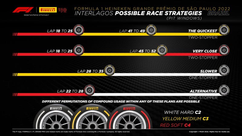 Per chi invece decidesse di puntare su un singolo passaggio ai box, si prevede la partenza su mescola Medium oppure su Soft e cambio con P Zero White Hard, con conseguente allungamento dello Stint finale. Due opzioni anche in questo caso molto simili, con forse un maggior vantaggio utilizzando la mescola più morbida nelle fasi iniziali del Gran Premio. Quattro opzioni emblematiche di come in F1 i dettagli facciano la differenza, tenendo sempre comunque conto che è soprattutto su un circuito corto e veloce come quello di Interlagos che traffico, incidenti e safety car possono rimettere in discussione ogni strategia studiata a motori spenti.