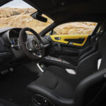 La carrozzeria gialla contrasta con il nero profondo del cofano e del tetto. Quest’iconica livrea bitono nera e gialla è corredata da grafiche bianche e nere, caratteristiche del “Tour de Corse 75”. La firma “Tour de Corse 75” sul parafango anteriore sinistro è completata dall’emblematico motivo riportato sulle porte che riprende il tema, dalla modanatura bianca sul cofano e dal n. 7 impresso sul retro che fa abilmente riferimento alla berlinetta da rally dei vecchi tempi.