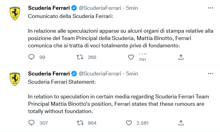 Da stamattina girano voci su un presunto avvicendamento Binotto-Vasseur dal prossimo anno. La smentita poco fa dalla stessa Scuderia Ferrari:“In relazione alle speculazioni apparse su alcuni organi di stampa relative alla posizione del Team Principal della Scuderia, Mattia Binotto, Ferrari comunica che si tratta di voci totalmente prive di fondamento“. Ancora non capiamo la leggerezza di troppi: gli addetti ai lavori sanno infatti perfettamente che se manca un comunicato ufficiale NON c’è alcuna notizia. Questo comunicato della Ferrari è l’unica cosa certa e quindi ne scriviamo. Il resto sono illazioni e fuffa.