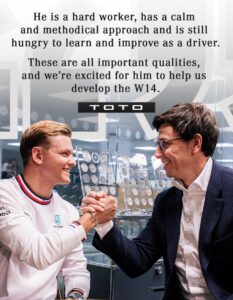 Toto Wolff, Team Principal and CEO of Mercedes-AMG PETRONAS F1 Team “Mick is a talented young driver and we’re delighted to have him join the Team. He is a hard worker, has a calm and methodical approach and is still hungry to learn and improve as a driver. These are all important qualities, and we’re excited for him to help us develop the W14. We also know that with two years of experience racing in Formula One under his belt, he will be ready to step into the car at short notice to replace either Lewis or George, should that need arise“.