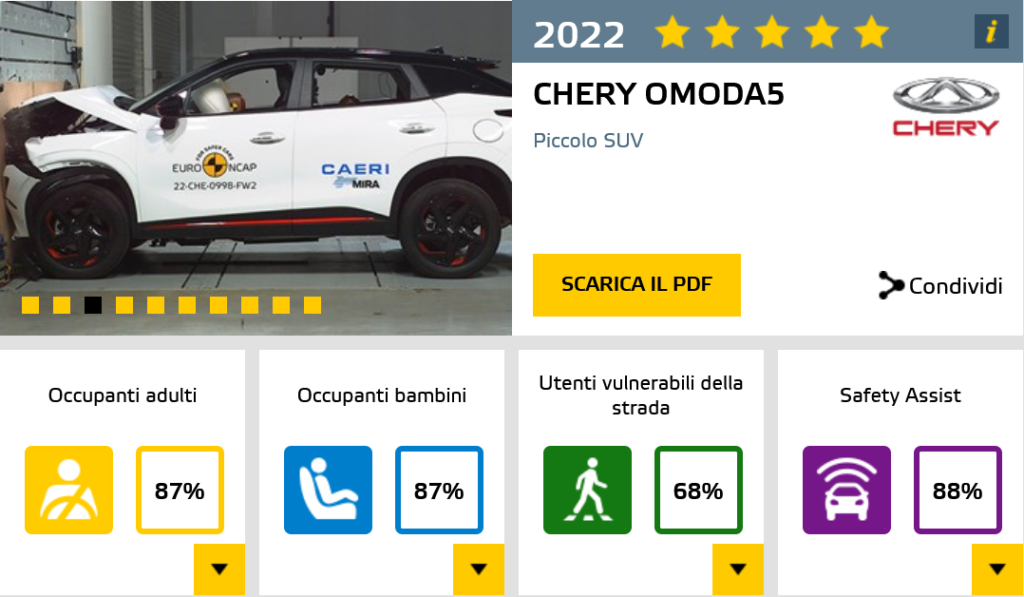 Chery Automobile si prepara al debutto in Europa, a partire proprio dall’Italia. Lo farà nel 2023 con un modello che conferma di posizionarsi ai vertici del mercato in quanto a sicurezza. La OMODA 5, prima vettura ad arrivare in commercio, infatti, il 7 dicembre del 2022 ha conquistato le 5 Stelle Euro NCAP. La OMODA 5 ha superato la valutazione di sicurezza più rigorosa con il punteggio più alto in virtù delle sue eccezionali prestazioni in quattro aree: occupanti adulti, occupante bambino, pedoni e assistenza alla sicurezza.