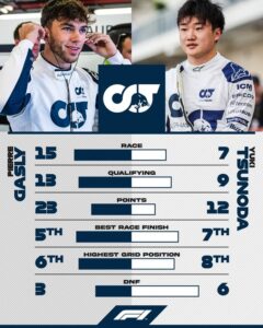 Gasly è una certezza. Potrebbe essere una pedina di mercato interessante per il 2023. Farebbe gola a molti team. Senza la pressione di essere vicino a Max è diventato un pilota consistente, sicuro e sempre veloce. il team italiano potrebbe iniziare ad andargli stretto. A Tsunoda non gli si chiede di fare miracoli. La riconferma è stata meritata. Ha una stagione di apprendistato sulle spalle. Può sorprendere molto e fare molto bene.