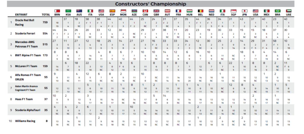 È difficile oggi credere che all’inizio della stagione la difesa del titolo di Verstappen sembrasse andare a rotoli. Un unico traguardo dopo i primi tre gran premi (nonostante la vittoria in Arabia Saudita) aveva portato l’olandese a raggiungere il sesto posto nella classifica piloti. Era invece sembrato che per la Ferrari si fosse aperta la strada per un trionfante ritorno in cima alla classifica, con Charles Leclerc che guidava la corsa al titolo di 34 punti dopo tre gare. Ma le sue speranze di ottenere un primo titolo nel campionato di Formula 1 sono quasi svanite, quando la situazione a metà campionato ha iniziato a vacillare; gli 11 gran premi seguenti hanno visto solamente una vittoria (Austria), un podio (Miami) e tre ritiri (Spagna, Azerbaijan, Francia) durante le gare da punti. Nonostante ciò la sua stagione si è conclusa alla grande, ottenendo il secondo posto assoluto davanti a Sergio Perez con l’altra Red Bull nel finale di stagione. Verstappen avrebbe potuto schiacciare l’avversario nel 2022, ma la seconda parte della stagione regala ottimismo per il 2023. La Ferrari, anche se non abbastanza abile a battere la Red Bull, è rimasta saldamente in posizione. E il colosso Mercedes dell’era ibrida nella storia della F1, che ha vinto otto titoli costruttori di fila grazie alle prodezze di Hamilton, Nico Rosberg e Valtteri Bottas, si è apparentemente ripresa da un avvio traballante nel 2022 aggiudicandosi il Gran Premio del Brasile in un finale in formazione uno-due.