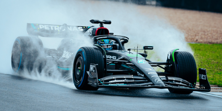 Yesterday the Mercedes-AMG F1 W14 E Performance completed a filming day at Silverstone. Damp conditions persisted throughout with George driving in the morning before handing the W14 over to Lewis for the afternoon. The drivers combined to complete the 100 km of permitted running on the National Circuit.