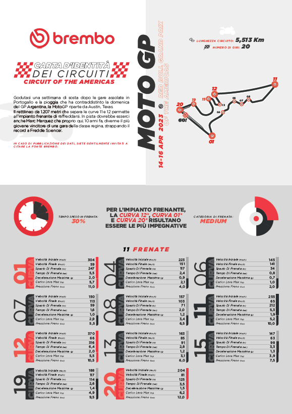 Dopo una settimana di sosta dopo le gare in Portogallo e la pioggia che ha contraddistinto la domenica in Argentina, la MotoGP riparte dal GP delle Americhead Austin, Texas. Secondo i tecnici Brembo che lavorano a stretto contatto con tutti i piloti del Mondiale MotoGP, il Circuit of the Americas rientra nella categoria dei circuiti mediamente impegnativi per i freni. In una scala da 1 a 5 si è meritata un indice di difficoltà di 3 anche grazie anche al rettilineo da 1.207 metri che separa le curve 11 e 12, permettendo così all’impianto frenante di raffreddarsi. In pista dovrebbe esserci anche Marc Marquez che proprio qui, 10 anni fa, divenne il più giovane vincitore di una gara della classe regina, strappando il record a Freddie Spencer.