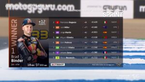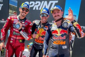 Brad Binder (Red Bull KTM Factory Racing) ha vinto la Tissot Sprint del GP di Spagna, con la seconda piazza decisa all’ultimo giro in un duello che ha coinvolto Francesco Bagnaia (Ducati Lenovo Team) e Jack Miller (Red Bull KTM Factory Racing), finiti nell’ordine dopo 11 giri del tracciato di Jerez. Quarto alla bandiera a scacchi Jorge Martin (Prima Pramac Racing), davanti a Miguel Oliveira (CryptoDATA RNF MotoGP Team) e alla wildcard Dani Pedrosa (Red Bull KTM Factory Racing): grazie a lui, il marchio austriaco ha messo tre moto nelle prime sei posizioni. Per Binder, il secondo successo nella gara del sabato dopo quello ottenuto in Argentina, nel secondo round della stagione.