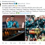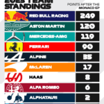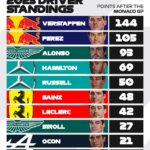 Domenica positiva per la Mercedes che lascia il Principato con un bel bottino grazie al quarto e quinto posto di Hamilton (che porta a casa anche il punto bonus del giro veloce) e Russell, che si è preso anche una penalità di 5 secondi per un contatto con Perez tornando in pista dopo un’escursione off-track, ma la pista scivolosa non ha influito sulla sua posizione finale.