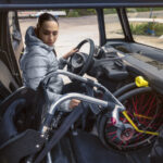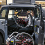 La carrozzina può essere trasportata in due modi. Può essere sistemata nell’abitacolo, sfruttando l’ampio vano portaoggetti di fronte al passeggero di Citroën Ami. Il conducente rimuove le ruote della carrozzina e le fissa nel vano piedi con una cinghia appositamente progettata. Le ruote si inseriscono perfettamente in questo vano portaoggetti. La carrozzina ripiegata viene posizionata sul sedile del passeggero. Viene fissata con una speciale cintura di sicurezza aggiuntiva. Questa configurazione consente al conducente disabile di viaggiare in modo indipendente.