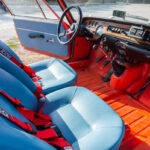 La vettura è infatti oggi nella caratteristica livrea in colore Rosso San Siro che Zagato scelse per le Competizione. Monta 4 ammortizzatori regolabili, 4 CN36 nuovi, 5 cerchi Campagnolo 13’’ originali, 5 cerchi (nuovi) Cromodora 14×6 con Vredestein 185/14 all season nuove. Il cambio 10/37 è stato preparato dall’Officina Ratto ed è anche adatto all’uso stradale ma rimane in dotazione dell’auto anche il cambio competizione corto usato per le corse in salita, perfettamente funzionante. La Competizione presenta carburatori Dell’Orto da 35 con trombette, radiatore olio, staccabatteria, rilevatore giri Brantz su cavo contakm, balestra anteriore su rulli a cuscinetti come in origine. Oltre al volante Ferrero Sandro Munari, viene ceduta con a parte il volante Momo usato da Radec nelle competizioni. Negli interni i pannelli e i sedili sono originali, nella caratteristica similpelle azzurra adottata da Zagato per le Competizione. Lo scarico è Inox Aros, nuovo, con collettore Gr4. L’auto ha anche in dotazione due scarichi laterali utilizzati in gara.