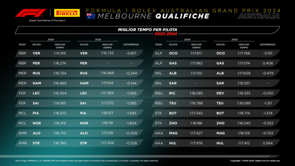 Da notare che il tempo della pole position è stato più veloce di oltre quattro decimi rispetto alle simulazioni della vigilia (1’16”350) e di più di sette rispetto alla pole position dello scorso anno (1’16”732), ottenuto peraltro con la mescola C4, nel 2023 selezionata come Soft. Interessante notare come si siano avuti diversi approcci in termini di preparazione del giro cronometrato con l’obiettivo di sfruttare al meglio la mescola più morbida: oltre al classico out-push-in, c’è stato chi ha fatto due giri di preparazione e chi invece, dopo il giro cronometrato ha fatto due tornate di raffreddamento per poi riprovare a fare il tempo.