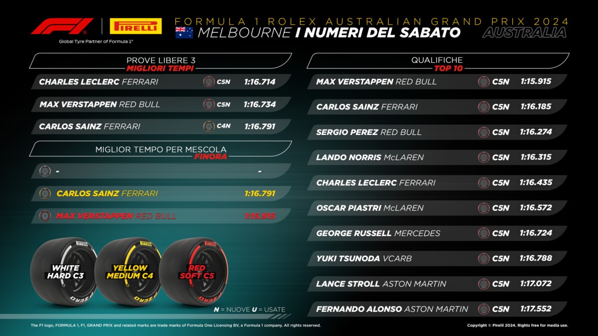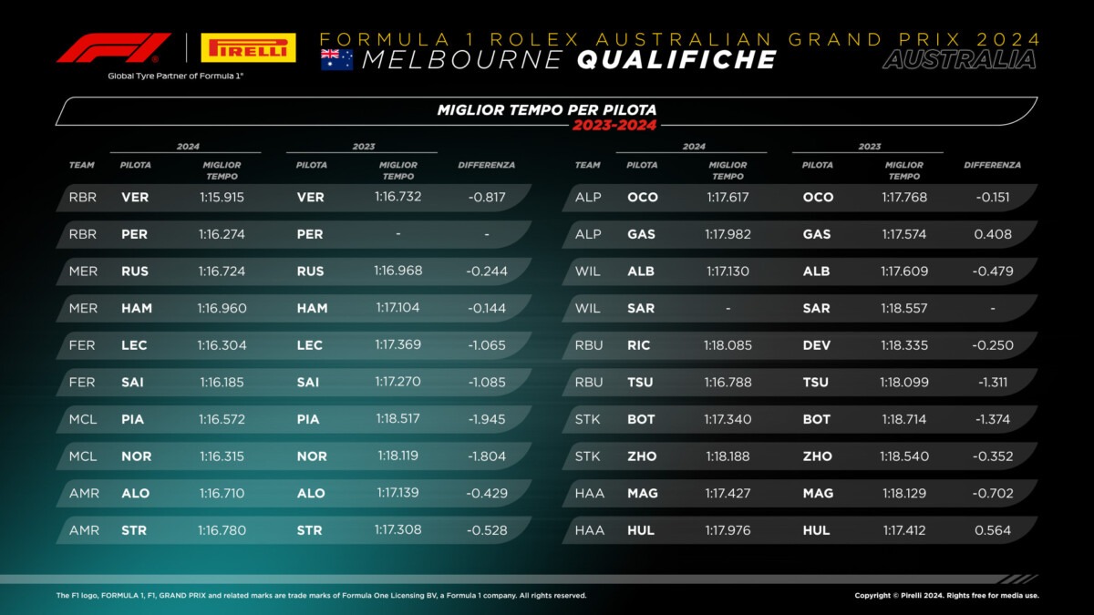 Prosegue l’imbattibilità di Max Verstappen in qualifica in questo inizio di stagione con la terza pole position consecutiva, la quarta se consideriamo anche l’ultima gara del 2023 (Abu Dhabi). Per il pilota olandese questa è la trentacinquesima pole della carriera, la seconda di seguito a Melbourne. Fino alla Q3 Max non era stato al comando di nessuna sessione in questo fine settimana – tre volte secondo nelle prove libere (una volta dietro Norris e due dietro Leclerc), terzo in Q1 e ancora secondo in Q2 – ma quando è arrivato il momento decisivo ha sciorinato due giri veloci che hanno messo KO la concorrenza, l’ultimo addirittura sotto la barriera dell’1’16”. Accanto al pilota della Red Bull partirà Carlos Sainz (Ferrari, 1’16”185) mentre in seconda fila ci saranno Lando Norris (McLaren, 1’16”315) e l’altro ferrarista Charles Leclerc (1’16”435), dopo che l’autore del terzo miglior tempo, Sergio Perez (Red Bull, 1’16”274), ha ricevuto una penalità di tre posizioni per aver ostacolato Nico Hulkenberg (Haas) in Q1.