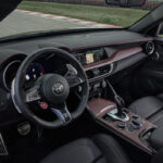 Dinamica di guida best in class, risultato della sorprendente leggerezza, dovuta all’utilizzo di materiali ultraleggeri come l’alluminio per il motore e la fibra di carbonio per l’albero di trasmissione, cofano, spoiler e minigonne. Su Giulia, rimane l’aerodinamica attiva con lo splitter anteriore in carbonio: quando attivato controlla la qualità di flusso d’aria che passa sotto il veicolo, aumentando stabilità e prestazioni. Infine, il sistema di scarico Akrapovich conferisce allo scarico un sound inconfondibile.