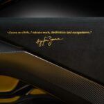 In contrasto con le finiture in vernice lucida e brillante, i pannelli in fibra di carbonio a vista con finitura satinata sono presenti all’esterno e all’interno dell’auto. All’interno, questi pannelli sono abbinati a rivestimenti in Alcantara gialla su misura con perforazioni verdi e a un indicatore bianco a ore 12 sul volante della vettura. Le soglie delle portiere rivestite in Alcantara nera sono decorate con la firma di Ayrton Senna e con una citazione che spiega la sua etica e filosofia: “Non ho idoli. Ammiro il lavoro, la dedizione e la competenza”.