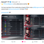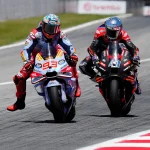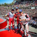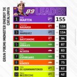 Ad avere la meglio, grazie a un sorpasso a quattro tornate dalla fine e un ultimo giro nel quale ha chiuso tutti gli spazi, è stato il #93, al terzo podio domenicale di fila dopo un recupero di 11 posizioni rispetto al risultato delle qualifiche. Il ducatista ha visto la bandiera a scacchi con oltre 10 secondi di distacco da Bagnaia: Acosta, risalito in sella dopo essere finito nella ghiaia, ha tagliato il traguardo con 31 secondi di ritardo dal vincitore, in tredicesima piazza nonostante la caduta. La quinta posizione è andata a Fabio Di Giannantonio (Pertamina Enduro VR46 Racing Team), che nelle ultime curve ha avuto la meglio su Raul Fernandez (Trackhouse Racing). Lo spagnolo dell’Aprilia mette così il segno ‘più’ al bilancio del fine settimana, raccogliendo il secondo miglior risultato personale nella classe regina dopo la prima fila nelle qualifiche. Settimo Alex Marquez (Gresini Racing MotoGP) e ottavo Brad Binder (Red Bull KTM Factory Racing), che nelle primissime fasi e dopo qualifiche convincenti sembrava in grado di tenere il passo dei primi: dal decimo giro è crollato e ha chiuso con oltre 18 secondi di gap da Bagnaia.