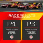 Il risultato è stato il frutto di un lavoro di squadra impeccabile che ha permesso alle 499P ufficiali del Cavallino Rampante di rimanere in lotta per la leadership nell’intero arco della corsa, ottimizzando le prestazioni delle Hypercar e diversificando le strategie in particolare nella scelta degli pneumatici, nell’arco di una gara caratterizzata dalla pioggia che ha determinato quasi sette ore di Safety Car, in particolare nella notte.