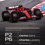 Nel primo pomeriggio Carlos e Charles sono scesi in pista con l’obiettivo di aiutare la squadra nella valutazione degli aggiornamenti, girando con due configurazioni differenti. Sulla SF-24 di Sainz sono state infatti montate le nuove componenti, mentre quella Leclerc, al netto dell’ultima versione dell’ala posteriore, è stata lasciata in configurazione standard. I piloti hanno quindi condotto un programma analogo per consentire le necessarie comparazioni e hanno iniziato il turno con gomme Hard per poi passare alla mescola Medium. Con questi pneumatici Sainz ha ottenuto il terzo riscontro cronometrico in 1’14”572, mentre Leclerc si è lanciato per il proprio giro veloce ma non ha potuto far segnare alcun tempo a causa di una bandiera rossa innescata da Fernando Alonso. Alla ripresa il monegasco ha ottenuto 1’15”434 ma le sue gomme erano ormai meno performanti. Nel finale di sessione entrambe le vetture hanno girato con più carburante a bordo e gomme Medium. Nel complesso le SF-24 hanno percorso 57 giri, 31 con Carlos, 26 con Charles.