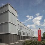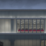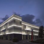 Le facciate esterne e i principali spazi interni dell’e-building sono stati progettati da MCA – Mario Cucinella Architects, studio all’avanguardia per lo sviluppo di soluzioni sostenibili e la rigenerazione urbana, in sinergia con il team di Ferrari. Di forma parallelepipeda e alto 25 metri, il nuovo edificio è in armonia con il paesaggio e gli edifici circostanti. Per la facciata è stata realizzata in maniera sartoriale una “pelle” altamente efficiente. La scelta di vetrate opaline, intervallate da porzioni di vetro trasparente, smaterializza la massa imponente dell’edificio e permette di distribuire in maniera diffusa la luce naturale al suo interno, mentre di notte ricorda una lanterna luminosa. Le componenti di facciata sono state progettate e prodotte secondo le logiche di Design for Manufacturing and Assembly (DfMA), in modo da facilitarne l’assemblaggio in sito e le operazioni di manutenzione. Ciò ha permesso di efficientare i costi e di ridurre gli impatti ambientali legati ai materiali utilizzati e ai processi.