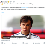 AGGIORNAMENTI Il pilota della Williams Alex Albon è stato squalificato dalla sessione per via di un’irregolarità tecnica riscontrata dai commissari al fondo della sua monoposto. Ad Albon, che si era qualificato ottavo, sarà comunque permesso di prendere parte alla gara, partendo da fondo griglia. Tre posizioni in meno, invece, per Lewis Hamilton, che si era qualificato 12°, per aver ostacolato il pilota della Red Bull Racing Sergio Perez durante il Q1. Un impeding del tutto inesistente, a detta di tutti.