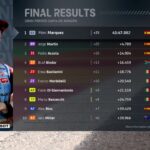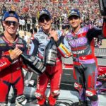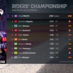 Secondo (stesso piazzamento di ieri nella Sprint) ma distante Jorge Martin, che adesso ha un vantaggio di 23 punti in campionato, dopo l’incidente tra Francesco Bagnaia e l’altro pilota del team Gresini Alex Marquez mentre lottava per il terzo posto a 6 giri dalla fine. Partito dalla seconda posizione, Pedro Acosta ha chiuso terzo, davanti al pilota KTM Brad Binder e a quattro Ducati – quelle di Enea Bastianini, Franco Morbidelli (Pramac), Fabio Di Giannantonio e Marco Bezzecchi (VR46). A chiudere la top 10 Alex Rins su Yamaha M1 e la KTM di Jack Miller, under investigation per possibile irregolarità alla pressione dei pneumatici.