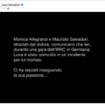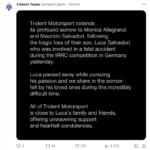 «Trident Motorsport si stringe a Monica Allegranzi e Maurizio Salvadori nel comunicare con dolore la scomparsa del figlio Luca Salvadori, coinvolto ieri in un incidente mortale durante una gara dell’IRRC in Germania. Ci ha lasciati inseguendo la sua passione. Trident Motorsport tutta è vicina alla famiglia e agli affetti di Luca».