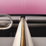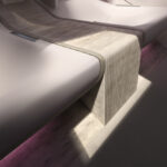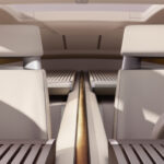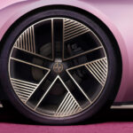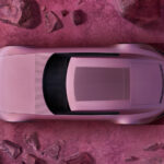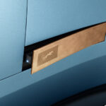 Una coppia di scenografiche porte ad ali di farfalla e il portellone posteriore “a pantografo”, quando si aprono, rivelano un interno modernista che condivide le sue esuberanti proporzioni con l’esterno. Il sorprendente abitacolo è caratterizzato da tre linee di ottone rifinite a mano che percorrono la lunghezza dell’interno, con una spina dorsale centrale in ottone lunga 3,2 metri che divide una coppia di pannelli strumenti fluttuanti. La pietra di travertino funge da basamento, sostenendo i sedili fluttuanti e l’ossatura centrale, ispirando anche il ricco pattern di cromie stratificate degli interni. I tessuti intrecciati aumentano il senso di artigianalità. Una mescolanza tattile di lana, ispirata ai filati tessuti a mano, avvolge i due sedili, la barra audio e il pavimento.