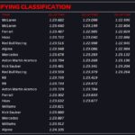 Terzo Carlos Sainz con Nico Hulkenberg quarto nella sua ultima gara con la Haas. Quinto Verstappen davanti all’Alpine di Pierre Gasly e alla Mercedes di George Russell, settimo. A chiudere la top 10 Fernando Alonso davanti a Valtteri Bottas e a Sergio Perez. Fuori in Q2 la Ferrari di Charles Leclerc quando il suo ultimo tempo è stato cancellato per i track limits, chiudendo 14°, per cui partirà ultimo per via delle 10 posizioni di penalità per la sostituzione del pacco batteria venerdì.