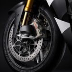 La nuova Panigale V4 Tricolore è inoltre la prima moto di produzione al mondo ad essere dotata dell’impianto frenante anteriore Front Brake Pro, composto da due dischi Brembo T-Drive alettati da 338,5 mm di diametro e 6,2 mm di spessore, che aumentano la potenza frenante e la costanza delle prestazioni. Questi dischi, testati dai piloti ufficiali Ducati nella Race of Champions 2024, sono derivati dai quelli racing utilizzati nel Mondiale Superbike sui circuiti più impegnativi, e sono accoppiati a pinze Hypure. Le pinze sono dotate di un trattamento di anodizzazione in color titanio e dal logo Brembo di dimensioni maggiorate. La pompa freno anteriore è infine una MCS 19.21 con registro remoto della posizione leva freno, come avviene sulle MotoGP e Superbike.