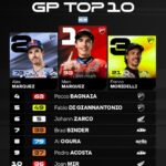 Per lo spagnolo si tratta della 90° vittoria in carriera nelle diverse classi, che lo porta a eguagliare il connazionale Angel Nieto, il secondo più titolato nella storia con tredici Mondiali. Una famiglia da record, visto che anche Alex per la quarta volta si è piazzato al secondo posto. Terzo gradino del podio per Franco Morbidelli (Pertamina Enduro VR46 Racing Team), con l’altro ufficiale Ducati Francesco Bagnaia quarto.