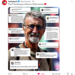 “Siamo profondamente addolorati nell’apprendere dell’improvvisa scomparsa di Eddie Jordan”, ha detto il presidente e CEO F1 Stefano Domenicali. “Con la sua inesauribile energia sapeva sempre come far sorridere la gente, restando sempre umile e brillante. Eddie è stato un protagonista di un’era della F1 e mancherà molto. In questo momento di dolore, i miei pensieri e quelli dell’intera famiglia della F1 vanno alla sua famiglia e ai suoi cari“.