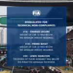 Lewis Hamilton, Charles Leclerc e Pierre Gasly sono stati squalificati dal GP della Cina dopo i controlli FIA post-gara. Lewis Hamilton perde quindi la 6° posizione per consumo eccessivo del fondo della sua Ferrari. per non rispetto dell’Articolo 3.5.9 dei FIA Formula 1 Technical Regulations. Per Leclerc e Gasly squalifica ma per problemi di peso delle rispettive vetture. Leclerc aveva chiuso quinto, mentre Gasly aveva tagliato il traguardo 11°. A fine gara i due e i rappresentanti dei team sono stati convocati per infrazione all’Articolo 4.1 dei Technical Regulations.