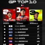 Morbidelli, che se l’è dovuta vedere con Johann Zarco (Castrol Honda LCR), ha chiuso davanti al francese. Vista la penalizzazione incassata da Vinales, retrocesso a 14°, il terzo posto è andato al #21. Quinto il rookie Fermin Aldeguer (BK8 Gresini Racing MotoGP) davanti al compagno di squadra Alex Marquez. Oltre all’episodio della prima curva, dove al fratello Marc è saltata una delle alette del codone, il #73 è stato coinvolto al terzo giro in un contatto con Fabio Di Giannantonio (Pertamina Enduro VR46 Racing Team), che in quel momento occupava la terza piazza. Lo spagnolo, tentando un attacco, ha mandato fuori il rivale, uscendo anche lui dalla pista. È stato penalizzato con un long lap che l’ha fatto scivolare fuori dalla top ten prima di risalire. Fra i primi dieci anche Fabio Quartararo (Monster Energy Yamaha MotoGP), Pedro Acosta (Red Bull KTM Factory Racing), Marco Bezzecchi (Aprilia Racing) e Luca Marini (Honda HRC Castrol).