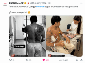 JORGE MARTÍN: “Grazie di cuore a tutte le persone che mi stanno supportando. Sono stati giorni difficili, ma ora inizio a muovermi un po’ di più e a sentirmi meglio, anche se il dolore è ancora tanto. Voglio ringraziare Aprilia, i miei tifosi e tutti quelli che mi stanno aiutando. Continuo a lottare per essere uno dei più forti di sempre”.