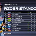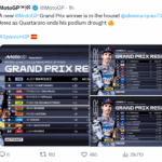 Alex Marquez ha dunque trionfato senza dover duellare col fratello, che si è tolto di mezzo da solo. Al primo giro il pilota del team BK8 Gresini Racing MotoGP ha rischiato parecchio: mentre era quarto, nella staccata della curva 6 è andato lungo e per poco non centra il #93, che quando è caduto, due passaggi più tardi, gli ha ceduto il terzo posto. Il #73 si è così trovato dietro a Bagnaia, che ha superato al quarto giro. Si è poi messo nella scia del leader Quartararo, attaccando il francese all’11esimo passaggio. Appena l’ha fatto, ha dato uno strappo. Il suo vantaggio nella seconda parte della corsa ha superato i due secondi. Poi è stato amministrato.