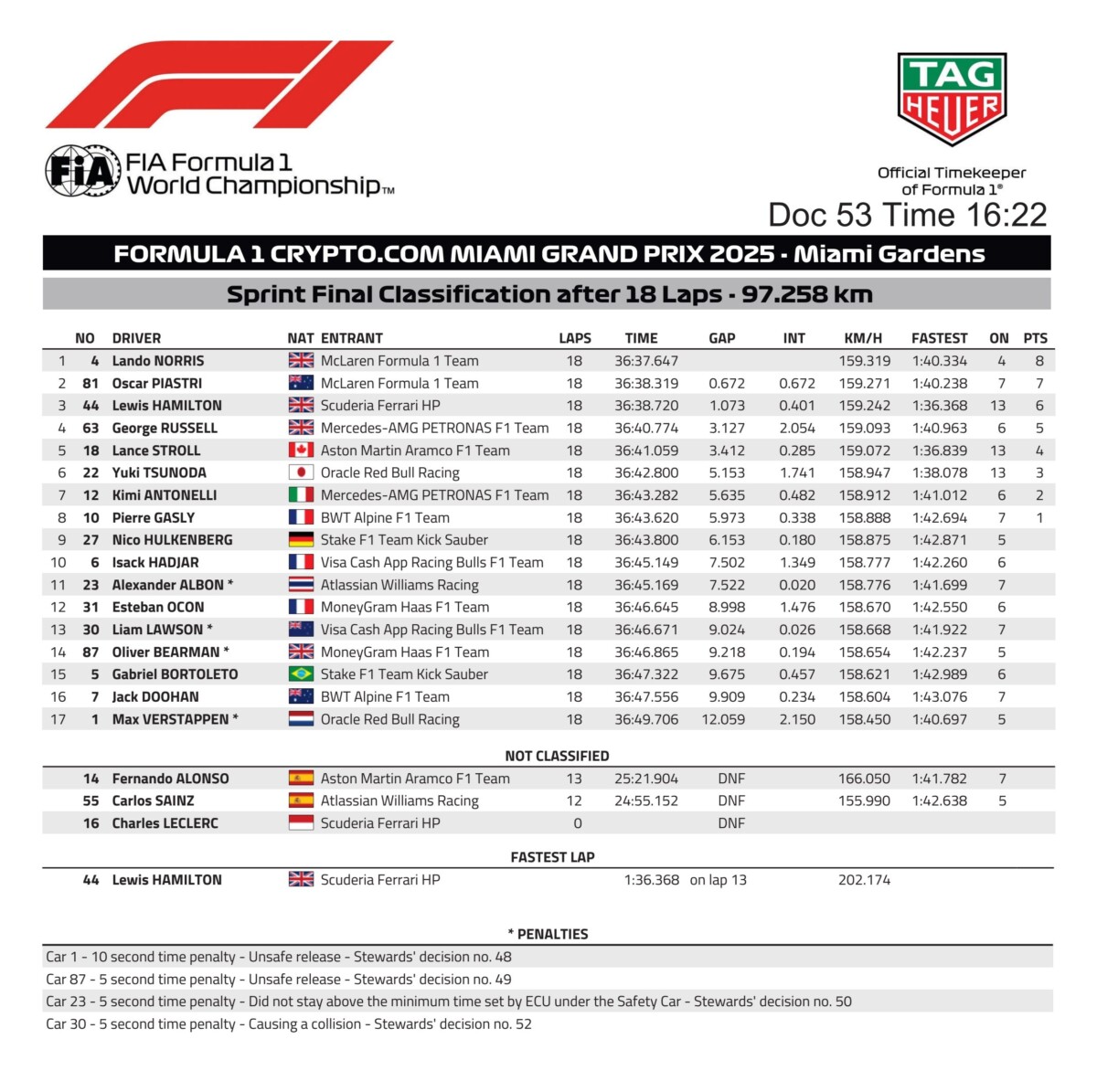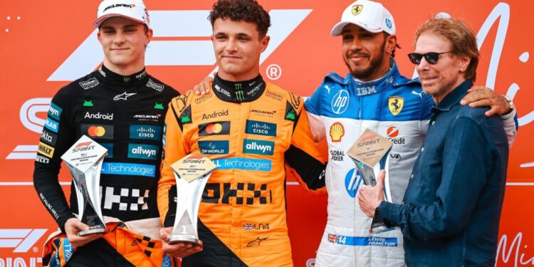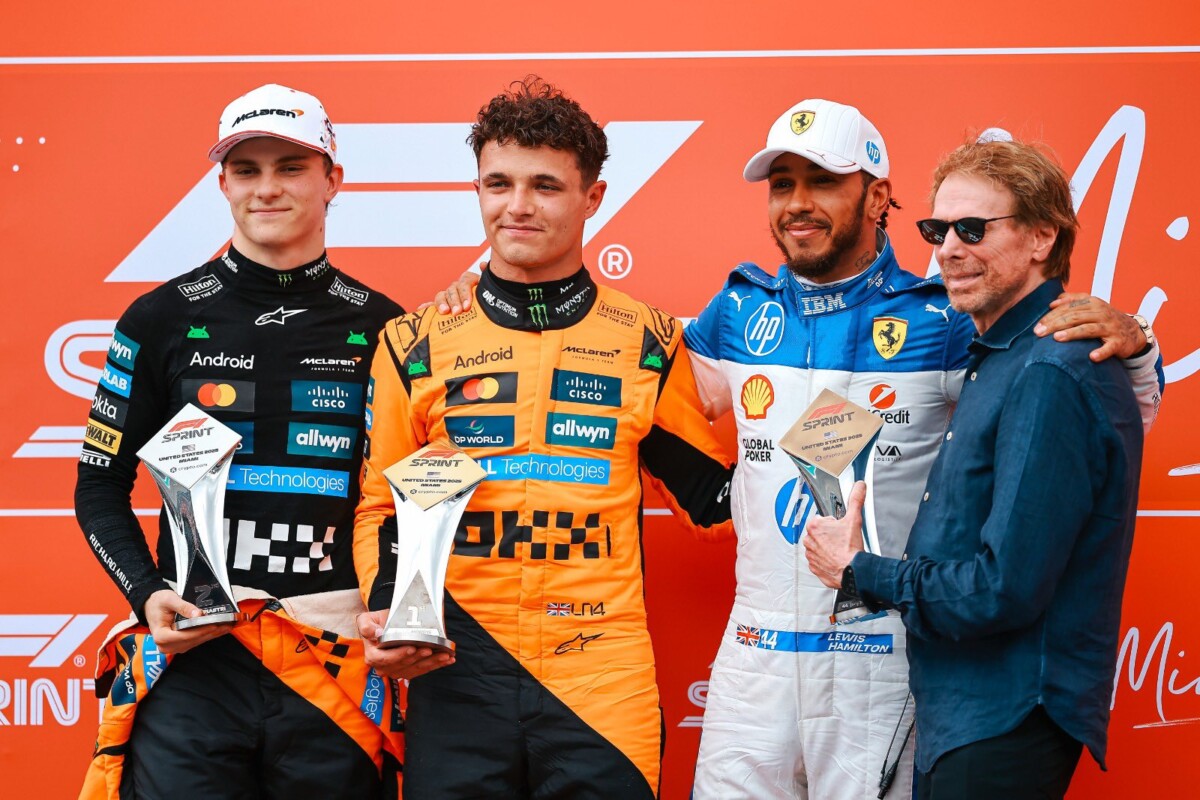 Doppietta McLaren nella Sprint a Miami, con Lando Norris davanti a Oscar Piastri e, terzo, Lewis Hamilton, in una gara in cui è successo di tutto già prima del via, piena di incidenti (e i meccanici ringraziano per tutto il lavoro che dovranno fare in vista delle qualifiche che scattano alle 22.00) e conclusa dietro la safety car. La Sprint è stata ridotta da 19 a 18 giri per la pioggia e le condizioni della pista, con scarsa visibilità che ha ritardato la procedura di partenza di quasi mezz’ora. Al via il poleman Kimi Antonelli ha tentato di difendere la posizione, ma è stato passato dalle McLaren di Piastri e Norris e da Verstappen.