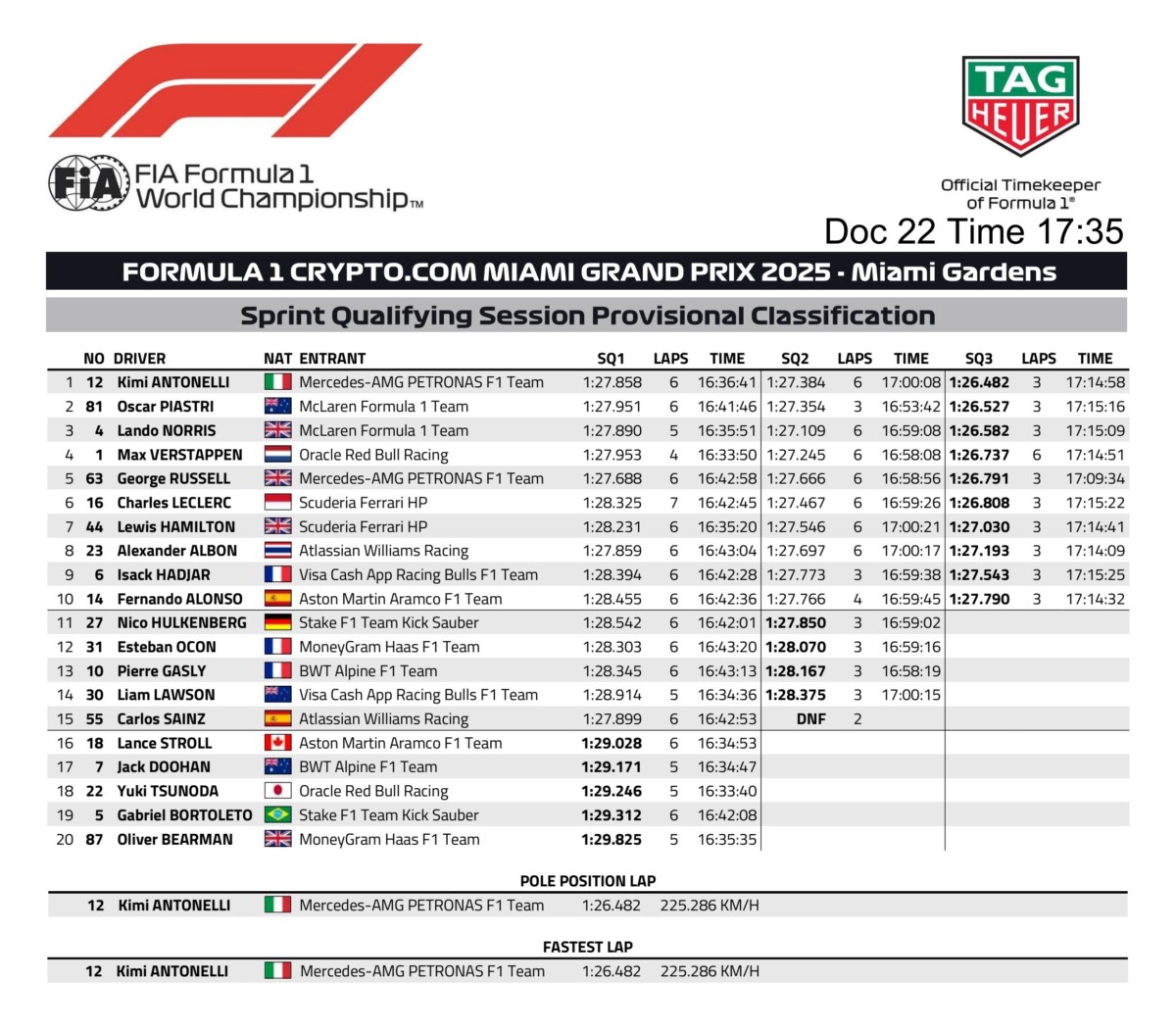 Un giorno indimenticabile per Andrea Kimi Antonelli, che ha conquistato la prima pole position dopo un giro perfetto nelle qualifiche Sprint del GP di Miami, battendo le McLaren e diventando il più giovane poleman in F1 in qualunque format. L’ultima sessione ha visto continue alternanze in cima alla classifica, con Max Verstappen che all’inizio ha battuto il tempo di George Russell, finché non è stato scalzato dal #12 della Mercedes col suo giro in 1.26.482s, che è anche il nuovo record della pista.