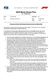 Dopo la Drivers’ Parade più divertente e originale che si sia mai vista in F1, è tutto pronto per il GP di Miami. In prima fila Verstappen e Norris, seguiti da Antonelli e Piastri. Terza fila per Russell e Sainz, poi Albon e Leclerc, con Ocon e Tsunoda a chiudere la top 10, seguiti a Hadjar e Hamilton, 12°. Tutto invariato rispetto alle qualifiche di ieri, eccetto Gasly che, dopo aver fatto il 18° tempo, dovrà partire dalla pitlane per interventi fatti sulla sua Alpine in regime di parco chiuso. Adesso unica incognita (a parte il risultato) è il meteo: la FIA ha diramato un comunicato per il rischio di forti temporali e fulmini, con tutte le misure di sicurezza e le indicazioni per mettersi al riparo. Speriamo che le previsioni siano sbagliate… Buon GP e buon divertimento a tutti!