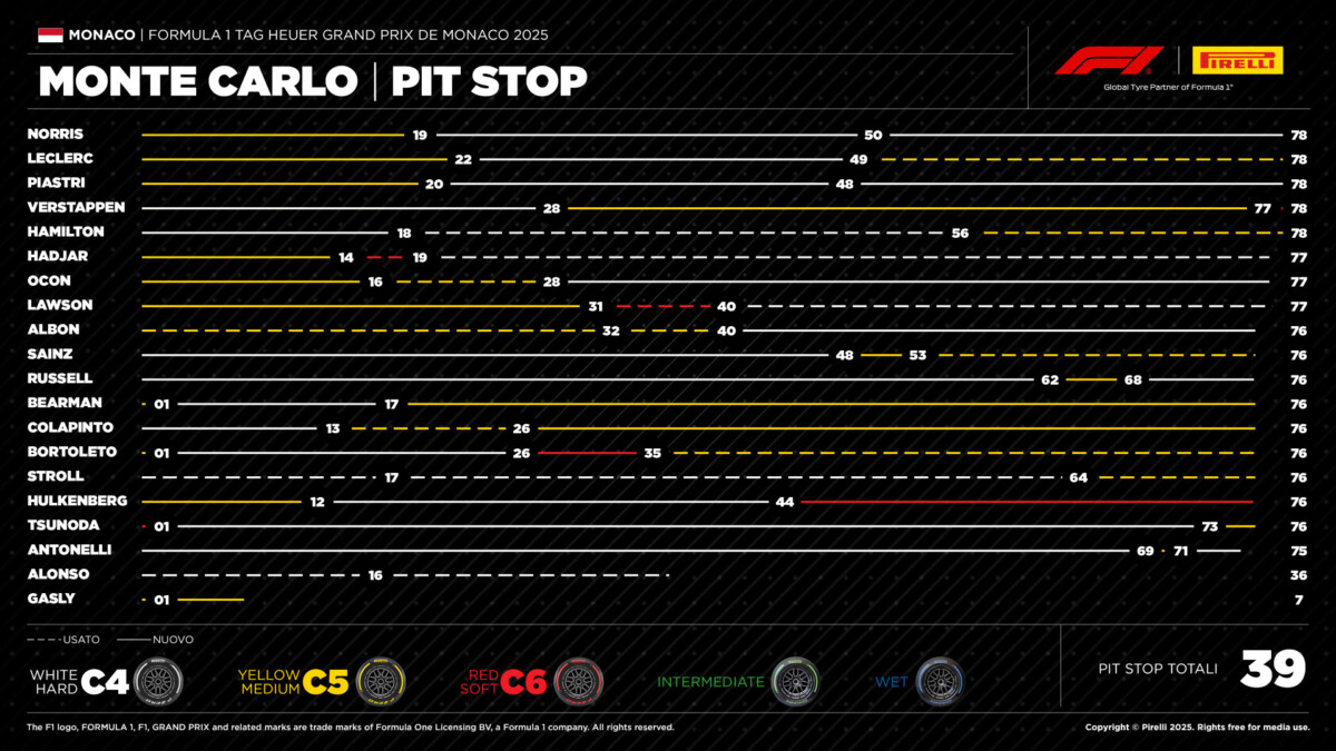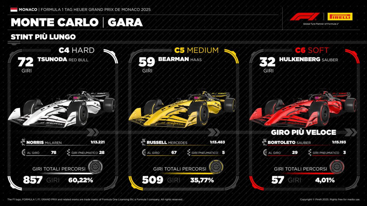 Mario Isola, direttore motorsport Pirelli: “Non è facile dare un giudizio a caldo sulla gara appena conclusa però sento di poter dire che sia davvero valsa la pena provare a fare qualcosa di diverso in un Gran Premio così speciale come quello di Monaco. Innanzitutto, va tenuto presente che la novità regolamentare introdotta ha certamente aumentato la curiosità non solo degli addetti ai lavori ma anche degli appassionati per come si sarebbe svolta la gara. Se è vero che oggi abbiamo avuto gli stessi primi quattro classificati della sessione di qualifica, è altrettanto vero che ci sono stati cinque cambi di leadership con tre piloti diversi che hanno condotto la gara e, alle loro spalle, c’è stata tanta azione, certamente molta di più di quanto, ad esempio, non si sia vista lo scorso anno. Onestamente, penso che gli spettatori – sia qui a Monaco che davanti alla televisione – tutto sommato si siano se non divertiti perlomeno non annoiati, come diverse volte accaduto qui in gare prive di eventi casuali, come la pioggia o delle neutralizzazioni. Del resto, Monaco è questa, prendere o lasciare: una qualifica da cuore in gola e una gara dove i sorpassi sono pressoché impossibili. Soltanto una volta analizzato bene lo svolgimento della gara, credo che tutti i protagonisti del nostro sport potranno fare una valutazione precisa di questo esperimento.