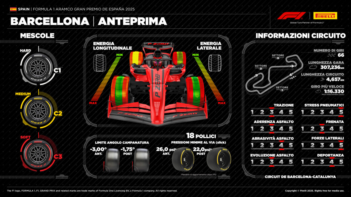 Così com’è sfidante per le vetture, il circuito lo è anche per i pneumatici. Dopo due appuntamenti consecutivi con la terna più morbida della gamma 2025, come tradizione, Pirelli ha selezionato per questo appuntamento quella più dura, con la C1 come Hard, la C2 come Medium e la C3 come Soft. Le tre mescole sono state rinnovate rispetto allo scorso anno, in particolare la C2, rendendole più equidistanti fra loro in termini di prestazione: ciò potrebbe portare a privilegiare Medium e Soft in gara. Le forze esercitate sulle gomme sono medio-alte, visto che sono sollecitate da diverse curve veloci, come la terza e le ultime due, entrambe a destra. L’angolo più stressato è l’anteriore sinistro, considerato che ci sono più curve destrorse.
