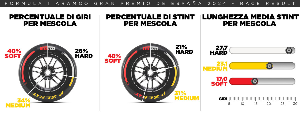 Da anni ormai il doppio pit-stop è praticamente obbligato al Montmelò e la gara dello scorso anno non ha fatto eccezione. Tutti i piloti sulla griglia hanno scelto la Soft per il primo stint: l’unica eccezione è stata Albon (Medium), che però partiva dalla pit-lane. Dodici piloti hanno utilizzato tutte e tre le mescole disponibili, lasciando la Hard per l’ultima porzione di gara, mentre i tre piloti finiti sul podio – nell’ordine Verstappen, Norris e Hamilton – sono passati sotto la bandiera a scacchi montando un secondo set di Soft.