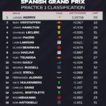 Quarto Norris, seguito da Leclerc, Antonelli e Alonso. A chiudere la top 10 l’Alpine di Pierre Gasly e le Racing Bulls di Hadjar e Liam Lawson. Come detto, solo 11° il sei volte vincitore del GP di Spagna Hamilton, seguito da Nico Hulkenberg, Yuki Tsunoda e dalle Williams di Carlos Sainz, Alex Albon, Lance Stroll, Gabriel Bortoleto, Ocon, Bearman e Colapinto.