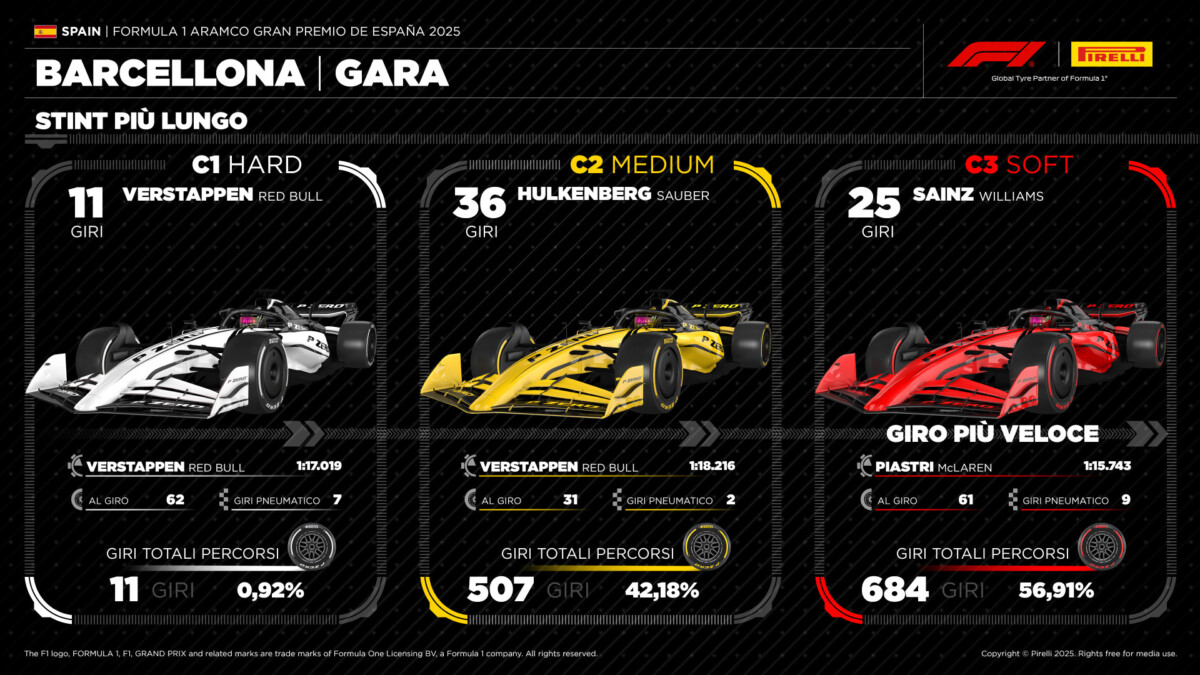 Mario Isola, direttore motorsport Pirelli: “Una domenica molto interessante per quanto riguarda l’utilizzo delle gomme. Così come accaduto lo scorso anno su questa pista, la Soft è risultata la mescola più competitiva, forse anche in misura maggiore rispetto al 2024. In termini di degrado, i dati visti oggi sono sostanzialmente in linea rispetto a quanto avevamo visto nelle prove libere di venerdì: significativo ma gestibile. Anche in termini di usura, sicuramente molto rilevante, non ci sono state sorprese, anche se in diversi stint si è arrivati al limite sull’anteriore sinistra, la gomma più stressata su questo tracciato.